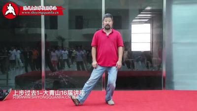 你看一看在一条线上,啊!先这样,开到这来。到这,两只手放在这。好,现在开始啊!往下蹲。先来这个,这个不要啊!哎,对。左边,这个右边不要,轻轻的放到这,看不出来,不要让别人看出来你在做这个。就是轻轻的你不是这样吗!实际上你这么一调整,你在这了。这时候你试一试,能不能抬起腿来,要抬不起来的话,稍微往这一偏,尽量不要让别人看出来,然后这个脚,从脚尖换到脚后跟,然后往外出,走过来。‘哎’,好.好,再看,看这。看这个中心,一定不要这么走,是怎么样,出来了,没动,用这个脚把它拉过来,出,落地。拉,这个地方是平移过来的。不是这么跟过来的。所以有这么个步骤。上步上的小一点,你上大了这个地滑,再一个上大了累,我们要练很长时间。