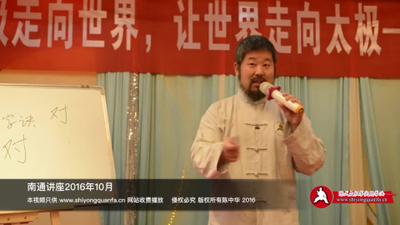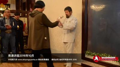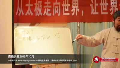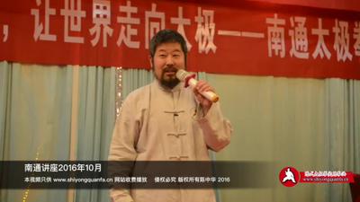 ….也给大家说了我们的步骤是怎样的。我想打乱一下,就是这个休息之后呢我还有几个问题,因不的话他一会忘了。可能大家刚才记得,因为讲了四十分钟,就是有关刚才讲的一些问题,然后我们再继续,最后再问问题,把这四十分钟的问题分成两段,一次呢二十来分钟。现在呢我想那个先刚才讲那个“不动”和这个里面的很多,就是怎么“不动”啊?他就会怎么样啊?我说这些东西,那个张局长你能不能先过来一下,我给大家呢就是很轻的演示一下,你站在这儿就可以了,就是你推我这个地方,但是不要推这个,推我,怎么都行,然后呢我这个就是在这儿吧,我想这样你推吧,这个可以,你看我想..哎.我想这么样,她的感受是这样,是吧?我也使了劲了,但现在呢?你再推吧,使劲吧,使劲行了,就这个时候你看吧,哎.不我还没开始呢,你的劲已经使了哈,就在这个时候,哎..别把麦克风搞坏了,就在这个时候你看吧,她在推的时候你看我一个指头你是站不住的,但是呢你再推,这个张局长是有功夫的,你看我这样搞就是我也没用大力,但是就是展示这个关系,你看她就有方法的,我想现在想拨她她都有方法,现在再过来你试,我这个吧也可以这样,你看就一个手指头,你是直接能起来的。这个神功是哪儿来的呢?就是有一个卡通,是..哎.这个卡通呢叫这个“神龟大驼背”,这是一个笑话,但实际呢是什么意思呢?你看这个有一个卡通是这一帮龟来了一个什么样的大自然的事情它都变成了人,后面有个..有个..“忍者神龟”是吧?哎.就是刚才这个动作呢,你那个..那个..我们再这样吧,这样你们这边能看见,你看你看我的后背,你们这边呢我会在倒过来的,我现…可以,没墙了,我想推你你来吧没事,你看我现在你看我的后背,他一直在动,所以一直在动呢我们是这样的,我现在呢死活的不动了,她也..她也..你看这个你看这动作,他后背一动也不动,如果我们正常这样的话,还是靠我的肌肉的力量,我们来是打架,一旦碰到墙你的力量巨大无比,因为墙这东西你是推不倒的,为什么呢?这个房子盖得他能让你推倒吗?那要推倒这房子根本验收不了,是吧?所以说你借它这个劲,就是说这个就是有了阴阳了。因为我动手的时候是阴的,就是他是在动的、没有力的、是活的,一定得有个死的和他来阴阳相配,那我们正常动作你看,我想推他了他一直是这么晃,这是不行的,但是你看就这样,所以太极的神奇呢?他后背不动了这一伸手,你看这手伸的很轻吧,力量很大,如果他晃了,你看我非常使劲,没有用。这个道理你们回去反复试,并且试的什么?学东西是个什么特点?..你想试是吧?