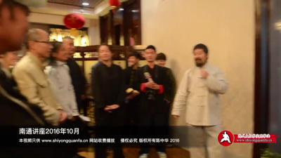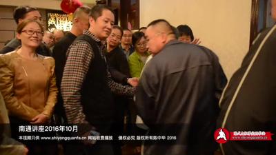 他是要往上走,往上走,往上走。哎!你别跟着我往上走。哎,不是,你不知道!你不知道,他是走了。这个呢,就是练功很难。为什么呢?你放在这儿吧,他微微移动上去了,你不知道!以后你们练拳,两个人互相看就知道。跟着走的那个人是不知道的。对方说你别晃,你说我没晃。有的师兄弟一辈子吵这个东西到最后也没有改过来。就是他没有觉得晃。为什么要有传承?为什么有一个人看,你自己是不知道的。所以你看吧,这,一个指头,你看。在这吧,你看他开始伸了,开始伸了,伸了,哎,看到了吧!现在你再看。然后呢?你捏着我这,用外面捏。你看,这是里面,这是外面。哎,用这个手。大家知道为什么我这样反复吗?我想让你做的动作你总是反的,因为你看事都是倒着看,所有人的规律。因为眼睛看东西是倒着看的,大脑把他调过来了。哎,用这个手,这个手捏住这里。哎再往后,微微捏住中间。哎,好,捏住了。你试一试中间的距离。刚才让这个张局长,已经试过了我的这个脊椎的距离了。这个你看是小臂,小臂的里面是骨头的,不是脊椎的。你现在试一试,试一试,试一试…现在你再试,你再试…哎,好,谢谢!