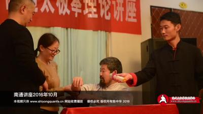 我先给大家说。练你得一步一步地上课。给大家演示。你过来,让这个张局长试,你看就行。你把一个手放在我的脖子上,我们这么斜着,一个手放在我这儿。然后呢?用这个,短,少一点。哎!这样。你呢要感受一下。你感觉一下你两个手用点力推它。嗯,对,这个也用点力。你感觉一下这两个之间的位置。我们做动作你看是这样的吧!现在你试!这个背呀,要能像一条蛇一样全部拉开。