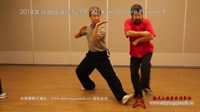 不够没到位,好,继续转,继续转,还没到位,哎!好,别动,还没到位啊,他一动也不动,这你别动,我给你做,这就到位了,好,好。脚不能落下去,脚后跟,不不不,他出脚的时候一定是这样,一定不要落下去。好,还不行,不要,你放在这个地方。出脚的口诀是什么?脚后跟蹬地脚趾头勾鼻子,脚趾头觉得往鼻子上发,你看这个,你看这个时候他底下一根棍往这么走的,你只要是上面松的他就顶着,好,好,哎呀,这个地方注意,你们刚才,你做的时候顺便给你们说一样,就到了这来,你看你肩它起了。我给你看啊,不管有多大的这个地方,对方压力多大,你一定是用他的力这不能够起来,不能起,一定是……好,还没做完,这个后面也不对也不对,没做完,没做完,别着急,别着急,不是到这了嘛,先过来,再出去,一步一步的,好。走,