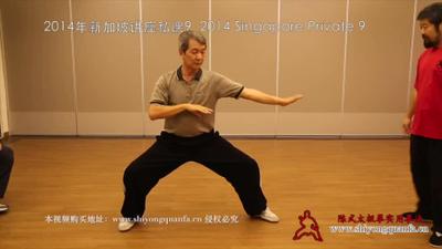 好,好,慢点慢点,慢点慢点不要动,你身体还没正,正过来正过来,再正,好,停,再找正,找正了,这个地方不能,哎,一定是弯的,肘永远是弯完的,走,不要动,不要动它在这,它呢在这,好,不要动啊把这个胯顶出来。再顶,再顶,再顶,好然后都不要动,一,二,三不动,把手伸出去,伸手的时候这三个点啊这三个点托着它,你就伸手你试试,这三个点不动,你伸手它就有力,伸手别伸……然后转着伸,哎,这就有力,你只要这三个点一晃你就没力了,好,太小,大一点,抬脚抬脚。这一个脚是实的,这一个脚是虚的,虚的,你开大一点,开大一点,虚的。你要不是虚的,两个都是实的,你就会出现这个问题,你看我们这样站的时候跟对方推,他推你这的时候你一定得……