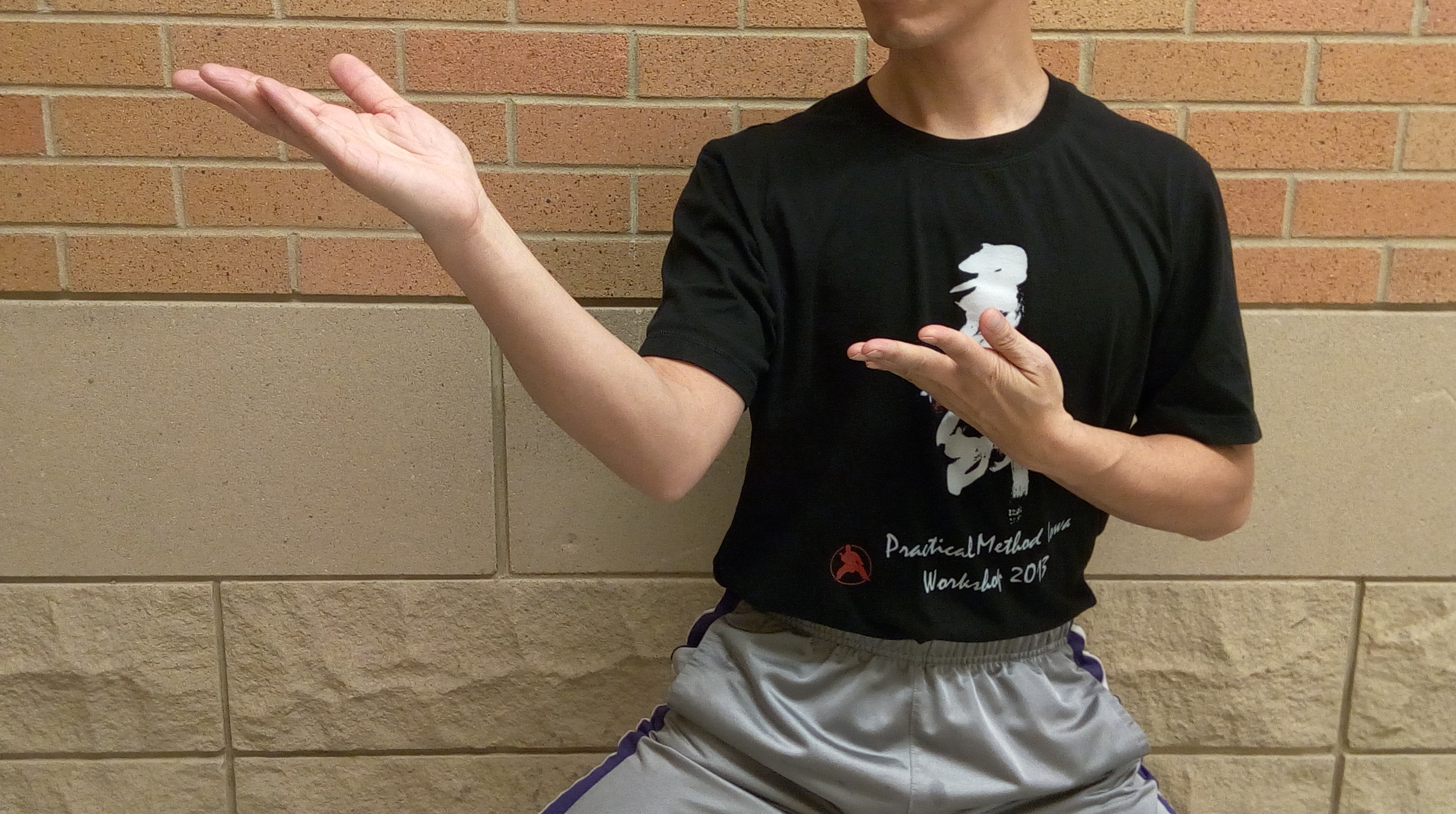 - 完成时,右手掌心面对外面,但手腕不动。右手掌心改方向因为肘往丹田转与肩也从背后往下转。