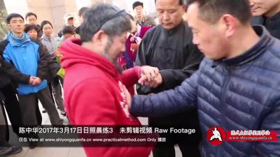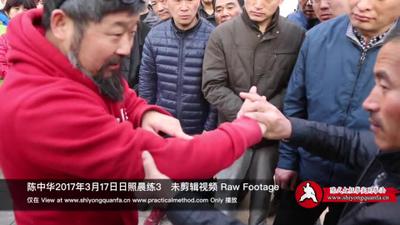 所以这个呢,刚才做的是大动作,你小动作,你看,他一碰在这,你随便做任何动作,你看,是这样的,但实际上他一做我转了一个圈,我的整个的你看吧,你一推我整个身体都走了,但走过没有这一点,嗯,他没有,并且我走到他背后去,他到那儿去了。所以将来真的交手他就是这个东西,就是他一碰的时候,你看,你看,我是在这儿的,明白吧?