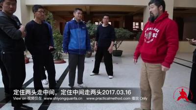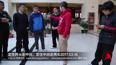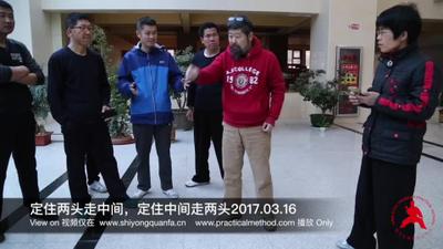 现在这不动,但是这是一个点,在这种情况下,我这两个点离这太近了,我这个点呢和它对上了,和脚对上了。这样,你试,所以胯不动了,打这两个点,这一个中间,你看看,这样转起来,所以这些东西啊,不管是从哪一个角度来谈这个问题,最后他都能合到一个理论上。你不能加一个角度,从这个角度看,一看,说过去原始理论不对呀,就我们最根本的理论不对啊。在动作上根本的理论已经说了很多遍了,反复重复,有一天你们自己突然感觉到了就行了。就是定住中间打两头就是杠杆,定两头打中间是个反杠杆,明白吧?