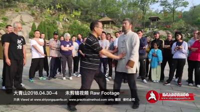 大家看一下,他这个胳膊已经收了一点了,这一收就不行了,英语…嗯哼,这个是加的是什么呢?他在推这儿的时候,我把这个手往前面一点,这个也往前,底下也往前,这整个的我是往前吞了一下,就是这么个意思,这么个意思,他不是这么样,所以他一碰的时候,你看,我走到前面去了,这个走到前面,英语…,他这里就不管用了,如果我和他这样,他就越推越厉害,英语…这样他就有劲了,这他就有劲了,但这个时侯你看,我已到了他的后面来了,他就,这个劲就没了,说所有的动做呢,他都包含这个东西。有的大,有的小。