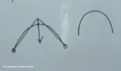 这个讲的是我们实用拳法的裆。外面的两个圈是胯的位置,是定住不动的,上面一定往下翻,往下压,就会形成一个拱形了,裆是承受力的,是不会动的,像拱桥一样。