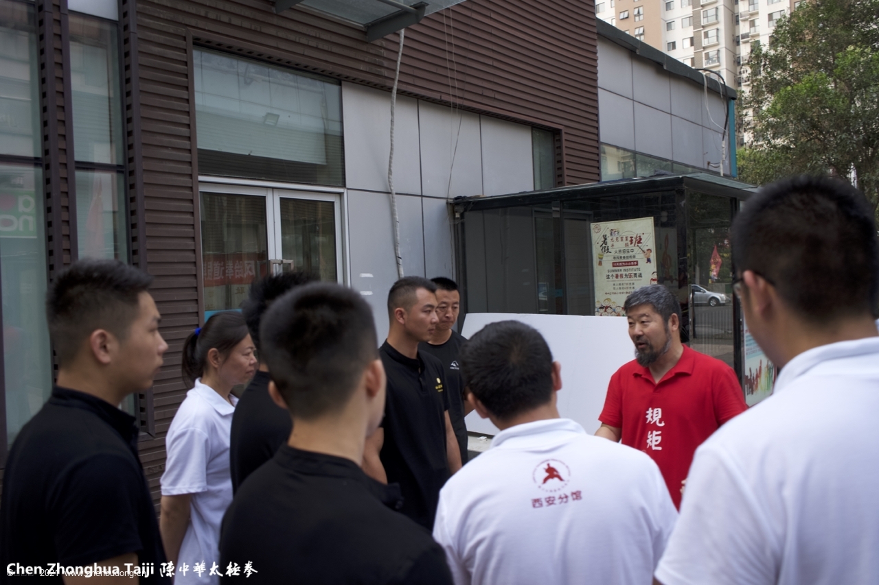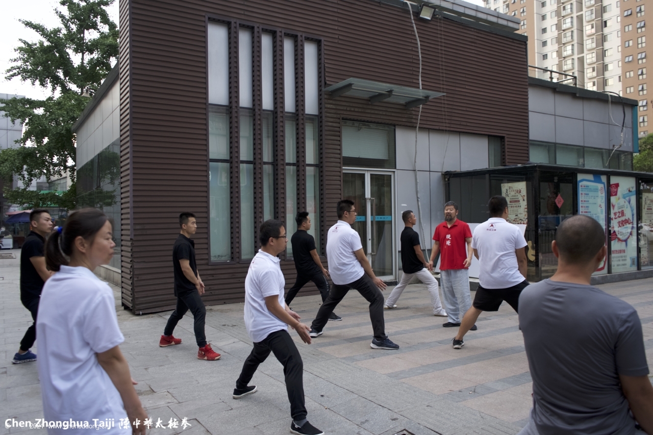 早上六点陈中华老师和同学们在馆前晨练。陈中华老师在给刘洋馆长讲拳。
