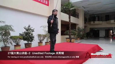 握住这个剑,我们应该是双指,我们今天用一个指头。然后呢,你们回家了,用胶布把这两个指头缠起来。缠上以后呢,你走它一个星期。你感觉上和它这么样。这个你看吧,几秒钟没有关系,但是一上午你就不行了。我们要练剑,这段时间我们要长期用胶布缠住这个地方,他习惯了就行了,然后再缠这边,他过一段时间,一开始用一个手指头,这是在训练,因为一开始,你用两根的话,一会儿你就累了,先用一根手指头。就是走这个劲,大家看啊!基本上看不到剑,看不到剑就可以了。你怎么样舞都行,一定不要让剑跑出来。哎,摇臂,剑在这个胳膊上,一定不要让这个剑跑。你看它这么跑了就不行,它在胳膊上。