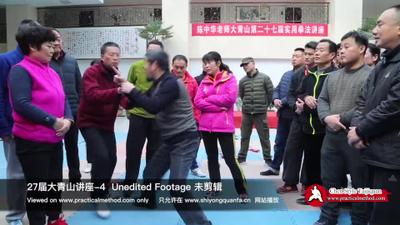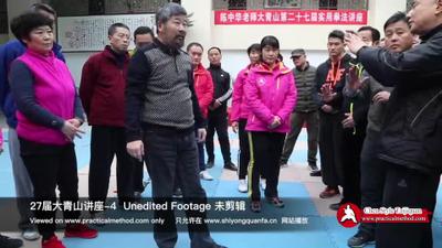 陈中华老师:你这么样,不动,哎,对,手放这里,你看,你用上力,你看,这边来一个,用上力,一样,往里挤,哎,好,你微微往这儿,哎,好,这不就挤住了么,往里收的时候你们是这么收的,跑了,看是怎么样,蹬的,感觉到蹬了吧。它蹬,这地方不动,这地方使劲蹬,没有办法,它身体这么转,并不是这么样跑的,哎,所以你看转过来了,然后我把手一调过来,这个脚再蹬,它就出去了,这儿不能动,这儿动的话它就是这样了,不能出现这种情况,所以定住这个丹田相当难,这个真正的拳谱里面要求定住丹田,洪老师的教拳方法说不定丹田,因为这地方太难了,因为你定住它,到处都是弯曲的东西,你用不上力,我们呢就拿着一个小臂定住它,就用它模拟来试验,希望得到这东西就全身都有了。