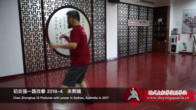陈老师:开始,哎,停。不要动。动作在这儿。使劲往这儿走,这个肘一动也不能动啊,好,继续,哎,它在底下,弯一下。但是呢。得仲的越远越好,但是不能直了。这个地方越往回越好。腰不能弯了。再做一个,好,再做,好。继续,記。不用再那么多了。好,接下一个吧。起,双震脚。哎,手不对啊,你这个地方别做过了,就这样就行了。就是很正常的动作。走。手动啦。
