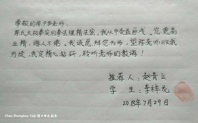 李祥花拜师贴2018.07.29 发表于 2018年7月29日 由 陈中华官网通讯员 拜师贴 李祥花-潍坊 尊敬的陈中华老师: 陈式太极拳实用拳法理精法密,我从中受益匪浅。您德高业精,诲人不倦。我诚愿拜您为师,望陈老师收 我为徒,我定精心钻研,聆听老师的教诲! 推荐人:赵青云 学生:李祥花 2018年7月29日 李祥花拜师贴 更多帖子苏雷拜师贴 (强烈推荐)王龙拜师贴 (强烈推荐)John Upshaw:何家伟推荐信 (强烈推荐)何家伟拜师贴 (强烈推荐)