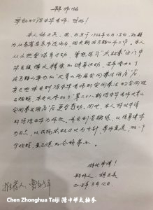 本次又参加了”第二十八期陈中华老师大青山实用拳法讲座”后倍感启发。为此,本人想学习好这门太极,故特此申请书:拜您为师。我会刻苦锻炼,用心领悟……以强身健为目、以弘扬太极文化为宗旨,尊师重道,做一个守规矩、重品德的合格弟子,认真接受您老师的考核。特此申请!