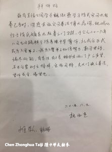 滋有五莲幸福公园学员魏淑燕学习陈式太极拳 法近一年多,深感本派实用拳法博大高深,现诚心归于陈氏嫡系太极拳之门习技,于公元二零一八年八月九号跪拜于陈氏陈中华尊师,礼成后正式成为入室弟子,我为入室弟子加倍努力,勤学苦练,竭尽所能,有责任,有义务维护本派门户之声望,并为后辈树立榜样,弘扬国粹,光大门派之拳法。望师成全渴望也。