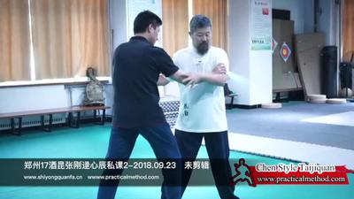 (学员:我感觉这个往下落,但这边好像不行)陈老师:他是直直落下去的,后胯往下落这个事,我们这个拳里面,陈式太极拳在古拳谱里最重要的一句话,有两句话,结构上最重要的一句话叫“下塌外碾”,“下塌外碾”就是你在这个杠杆儿,就咱这一杆秤,你抓着那一头,哎,这是中线,你把手放上面,你抓住他。他就是外,你这个地方只要下去,他就给碾出去了,他只要往下,这个地方就是往外打,中间有个中,中不能跑了,就是这个架子你得顶住了,所以,这个中是什么呢,怎么样才能最结实的中,什么样的中都是不行,是一个空的。