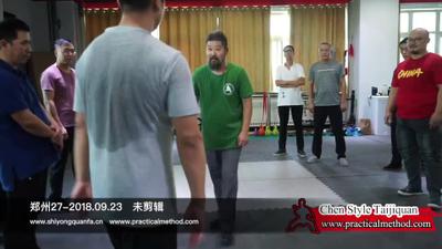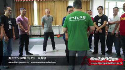 陈老师:明白了吧,一悠就没有了,就这么简单,这个肘、肩一样,你看,你一碰我,跑了,是吧?现在看,你看,有没有动作?你来做做动作你试,随便,没有吧?怎么样我也不能动,这儿也没动,你看,一动就不行了,所以,将来你看,他一上来,你看,就在这儿,你们看,是不是动了?