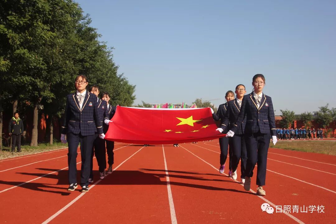 运动员方队入场后,教导处牟主任宣布运动会开幕,升旗仪式正式开始。国歌奏响,五星红旗冉冉升起,全体队员敬礼,全场齐唱国歌,向国旗行注目礼。