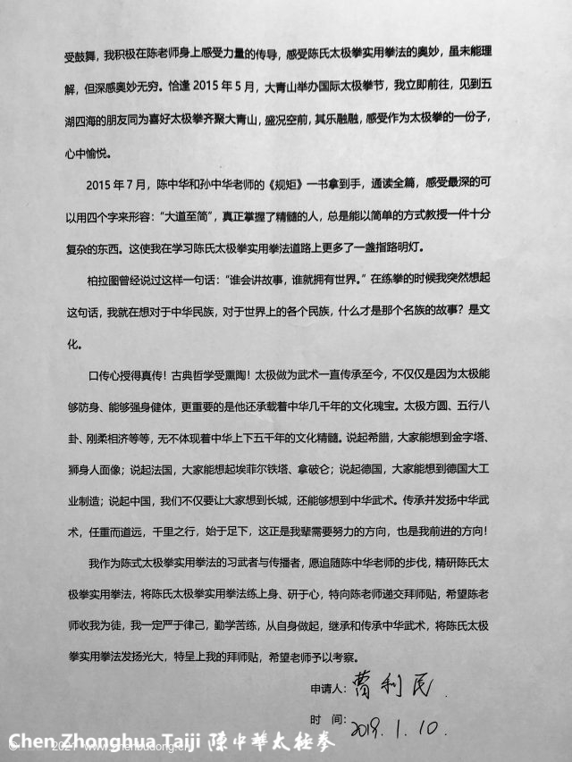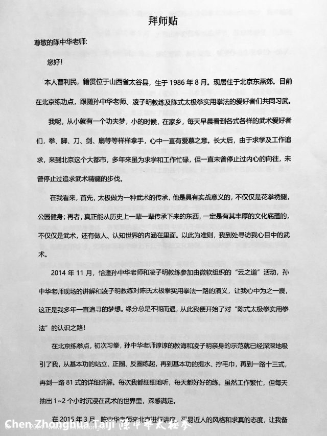 我作为陈式太极拳实用拳法的习武者与传播者,愿追随陈中华老师的步伐,精研陈氏太极拳实用拳法,将陈氏太极拳实用拳法练上身、研于心,特向陈老师递交拜师贴,希望陈老师收我为徒,我一定严于律己,勤学苦练,从自身做起,继承和传承中华武术,将陈氏太极拳实用拳法发扬光大,特呈上我的拜师贴,希望老师予以考察。