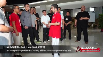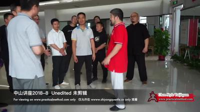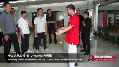 陈老师:对,就内么,它从里往外的。所以打上的时候是地下走的。就这个地方你看。你要这么随便一过来你看,我这么一抓你。就想走这个地方。是脚底下的劲啊。所以我上边你没看见就微微的碰了一你一下。脚底下这个劲。所以洪老师说劲要踏好。就劲到地下去了。上边就可以这么。唉,它要相当稳