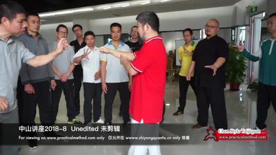 陈老师:嗯。学员:它在动里,我们抓的只是一个皮。学员:千斤顶那种。陈老师:所以发人的时候。你看就是这点。是,你抓着我给你试。一个手在,唉对对对。另外一个手微高一点。唉,唉对。你抓住。你试,就做这个动作。就我打你们的时候。他不是这么打的。是这么打的。你试。