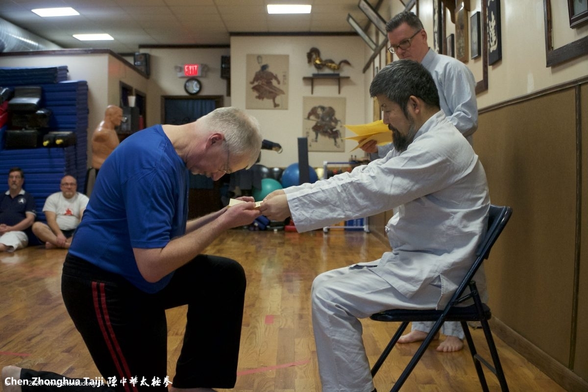 James Massiello 吉姆斯・马斯马娄在拜师仪式上向陈中华老师正式换贴。纽约新神馆馆长、陈中华老师的早期入室弟子麦克・克兰德拉在背景中作为证人。