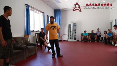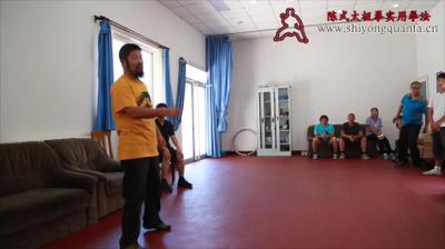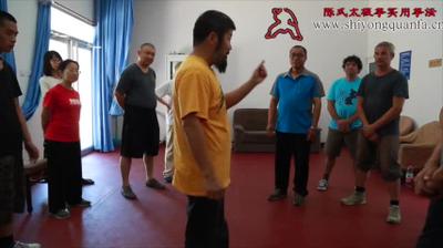 陈老师:啊,他气死了。就这个不公平气就气死了。所以你紧张没有用。所以我们这个。我们这个练拳这个思路。你初级的时候你功夫不高。唉,所以呢。用个什么思路,这个大家一定得记住,一开始这个思路。你功夫不高,你跟人推手你要失败。但是呢我有一条,你看电影就我刚才说,叫从容就义。就是什么意思呢。我要败,但是按照我的要求败。明白吧。我反正失败了。但是我要把这个动作做完。