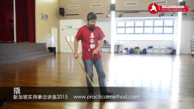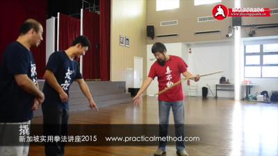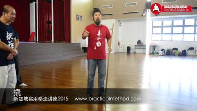 你要马上要打扫,不然的话,新加坡警察要来了,嗯,这下好了,中棍成短棍了。什么意思呢?再借你的这个,我这么通过来,他堵着,以他来当个定,撬他。不是从后面这么顶他,所以我们这个作是什么意思呢?对方的腿在这儿,我不是过去顶他,而是一碰,然后“啪”,从底下插过去,一落地,“啪”拉过来,就是杠杆这个东西。唉,虽然有点损失,但是这个动作说明了吗?