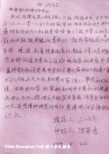 因崇拜陈老师的功夫,更仰慕陈老师的为人,近几年一直在网上观看陈老师的视频和文章,又多次参加您和您安排的讲座,并一直坚持学习和训练着,是五莲幸福公园实用拳法团队的一名拳友。期间一直深深被陈老师的功夫和武德所折服!为了弘扬陈氏太极拳实用拳法,传承和推广陈老师的功夫,我恳请拜陈老师为师父,恭请陈老师安排拜贴大礼!