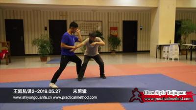 看到了吧,走,捋过来,你看一打没打着,我一撞你,撤步,哎好,看他一到这来立刻上来,哎穿喉,你看一穿喉,我一堵,啪的一下打这,这个呢打在这,这往下按,按下去,一按没按着掏裆,哎好,你看一掏裆,伸进去,把手一翻,你看这不抓住了么,抓住以后顶住,我这不使劲么,
