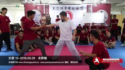 说要不知道,还得抓住,没有用。就是你抓不住,别的都没有用。(收肘。)你看见了吧?就是看不到肘的那一点,我们整个这个过程就是没肘了就行了,这是第一步,我们练拳的第一步就是无肘!练过散打的?(练过。)站在这儿。