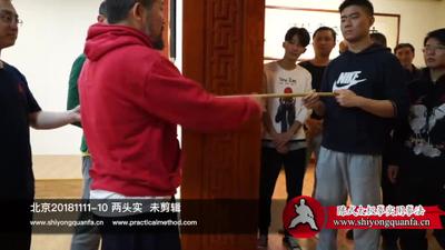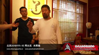 陈老师:啊。要的话。就是这样的。这就可以要,不要的话,这一碰我一使劲儿他就没了。嗯,后面只要顶着。前面一做这个。你看。这个前面你们看这。这个他没有力。这个往后这一点。这一下就行了。他就这地方就打烂了。所以能不能找着那个根儿是很重要的。所以跟人一交手这个后脚就不能动。然后身体的后半部分得合后脚。