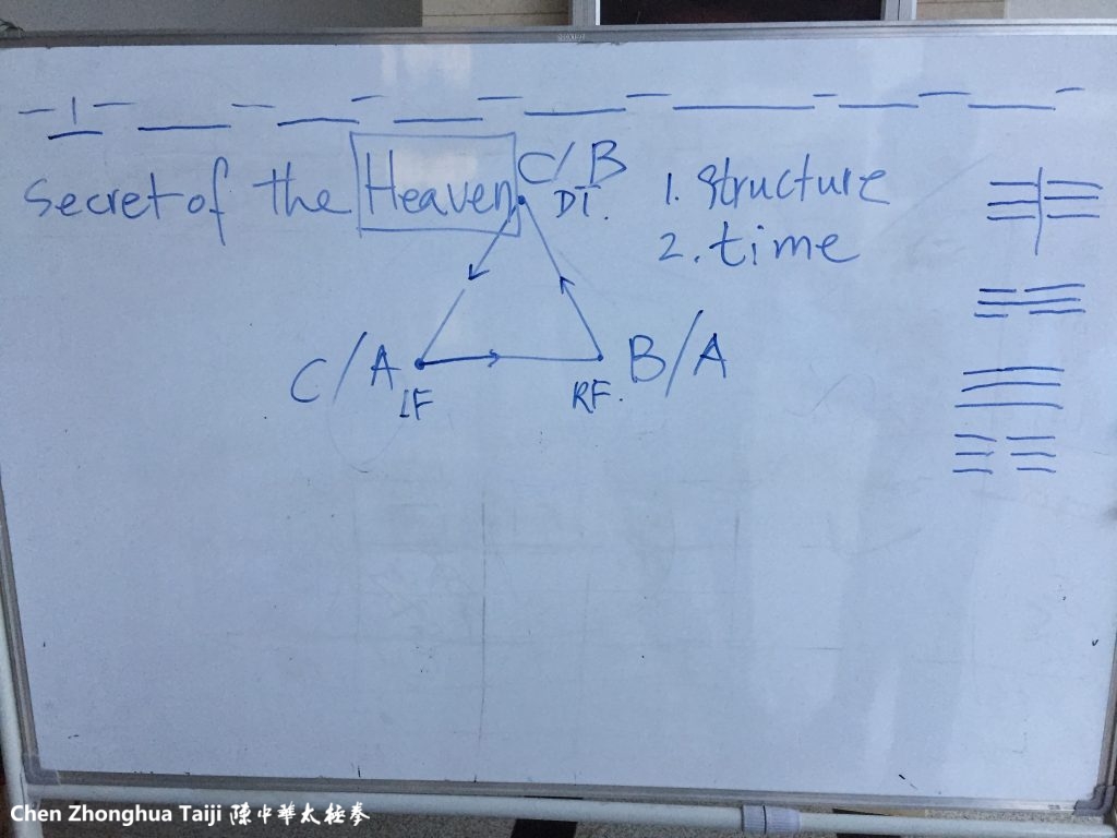 陈老师说我们身体上的时间可以分九层,简化来说明,分三层。画出一些符号,三连、六断,仰盂、覆碗等。陈老师是用这些符号来表示身体不同部位的开合或者说动静(并不是在讲卦象!!)