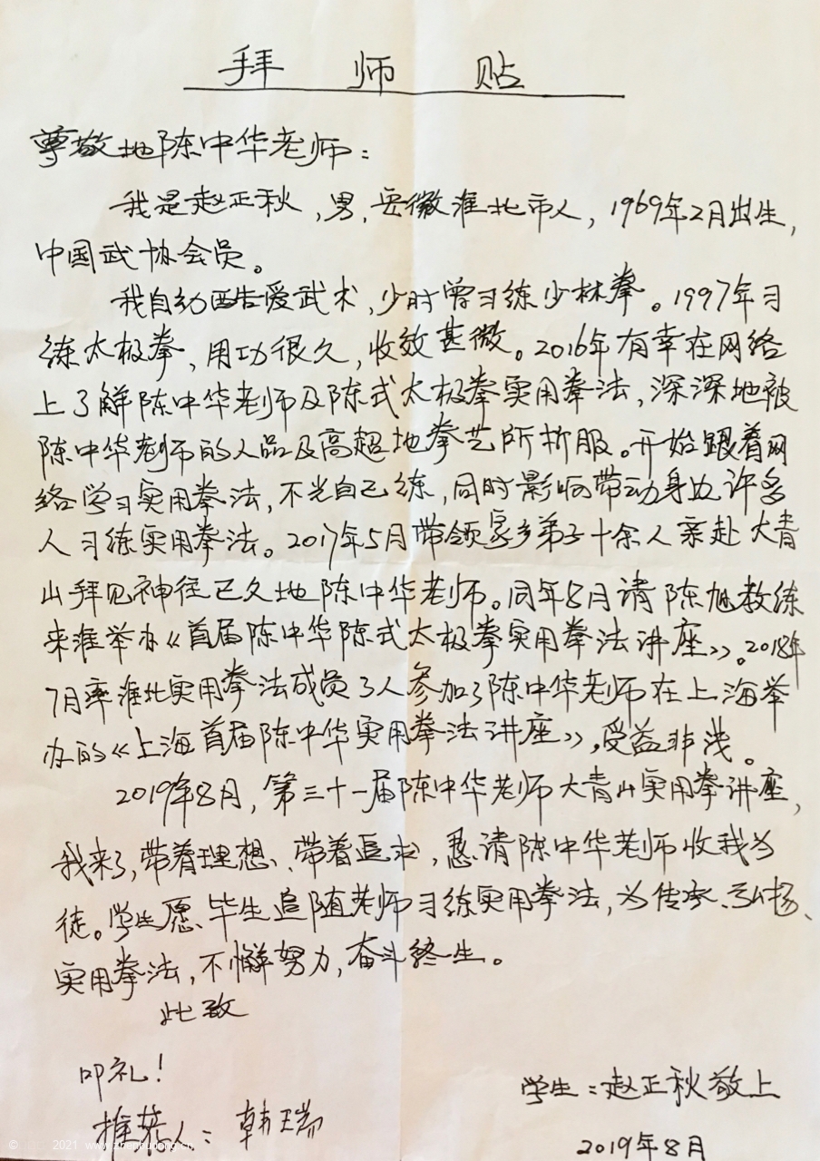 赵正秋在陈中华老师第31届大青山实用拳法讲座上向陈中华老师递交拜师贴201908