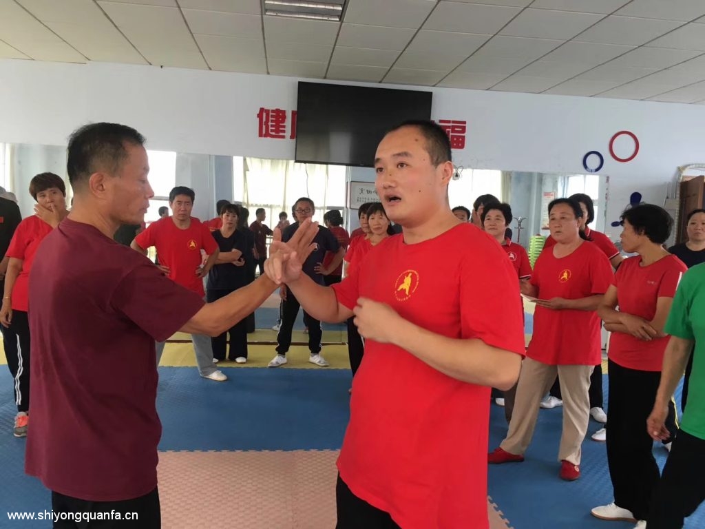 今天是老年大学下学期开学第一天。上午韩教练带领学员分组复习了基本功和套路1、2、3段。又反复讲了怎样定住手、肩不动只转肘。然后学员两人一组进行练习。