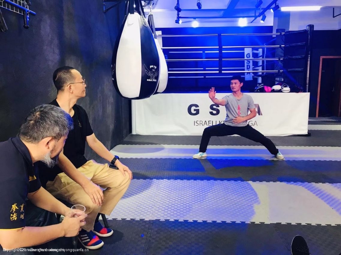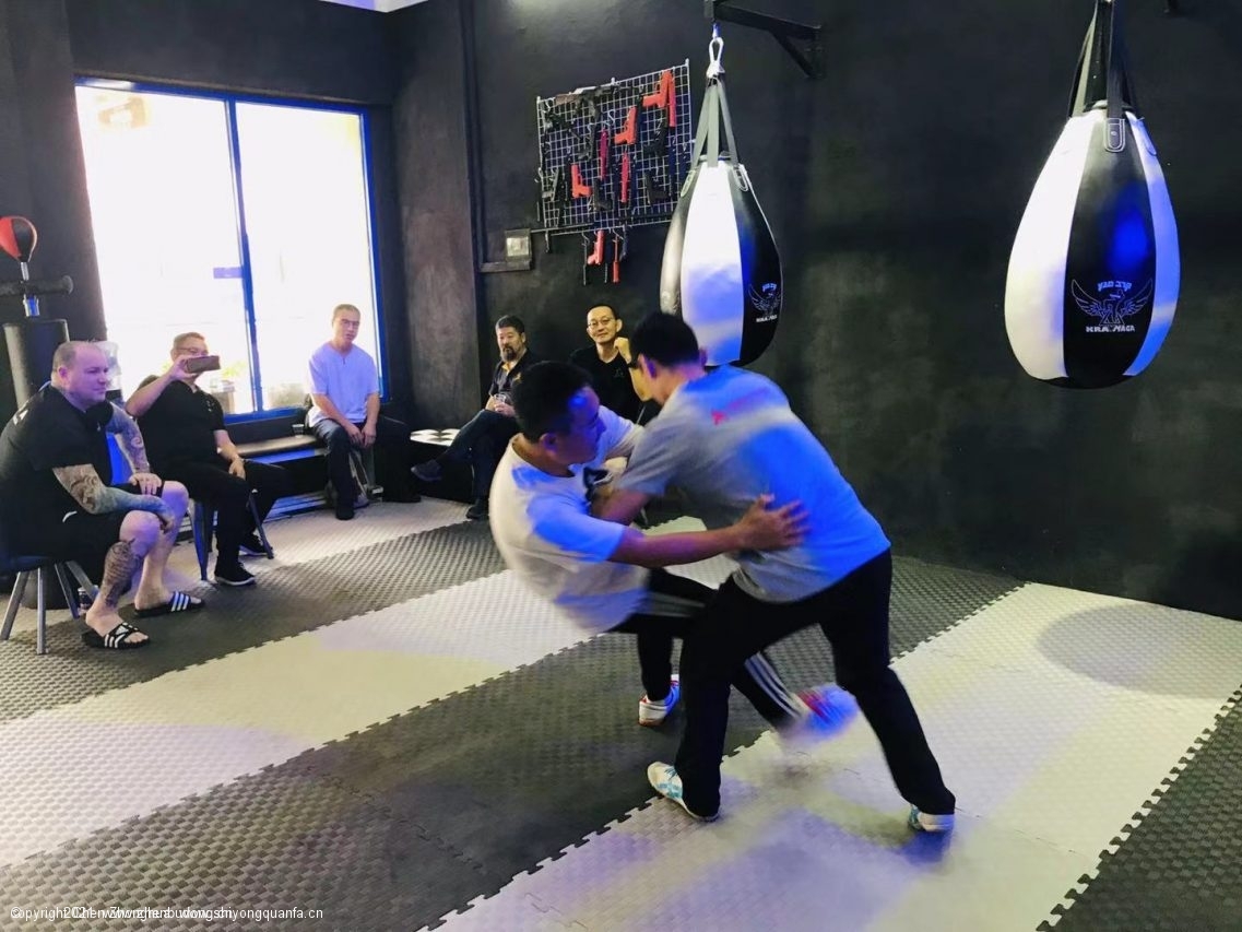 陈旭在GSDA以色列近身格斗创始人白龙馆内表演实用拳法。