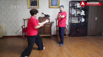 师父:你记住这个,哎,有了,有感觉了吧,是这样,然后就这么想,哎,你别推啊,你退脚不能退这儿,你把手放这,感觉一下,你看推了吧。